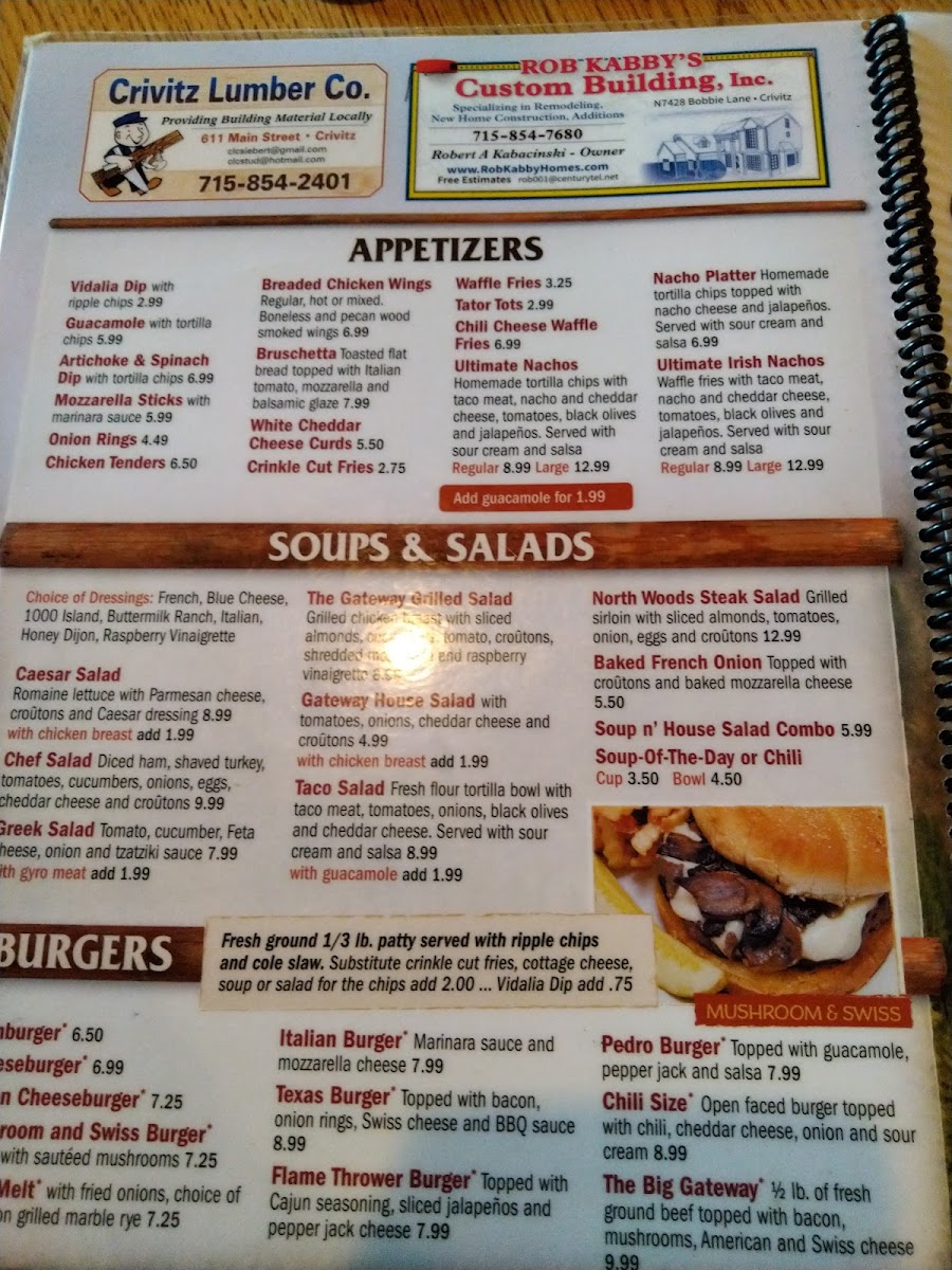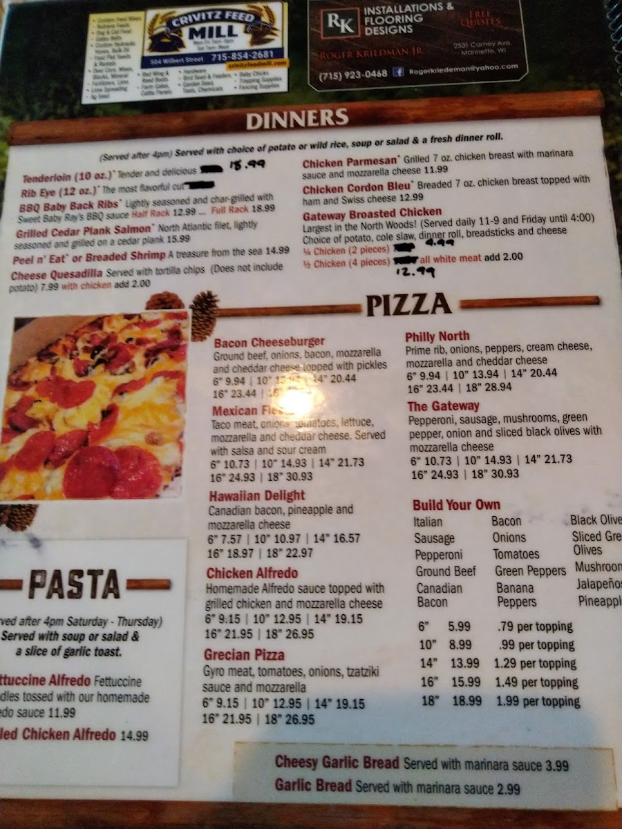 Welcome to Gateway Bar and Grill, an inviting spot nestled along U.S. Hwy 141 in Crivitz, WI. The menu tantalizes with a variety of 18" pizzas, each crafted to perfection. Signature pies like the Bacon Cheeseburger and Grecian Pizza showcase bold flavors that are sure to satisfy any palate. Families will appreciate the kid-friendly options, including classic Mac and Cheese and Chicken Nuggets, all at a budget-friendly price.